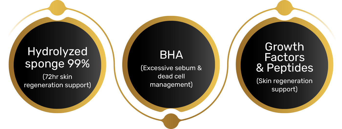 They penetrate the skin to help the skin to receive active ingredients better. Over about 72 hours, they aid in skin regeneration support by removing dead cells and exfoliating, thereby helping with skin regeneration, excessive sebum control, soothing, and antibacterial actions.